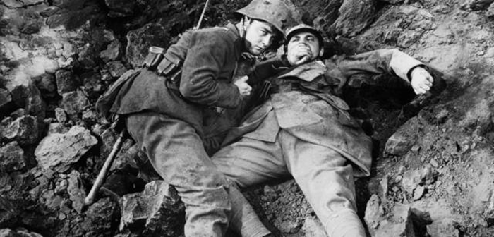 naive Kriegsbegeisterung wird bereits in der Kaserne durch einen sadistischen Ausbilder gedämpft; an der Front erkennen sie schliesslich die Sinnlosigkeit des Krieges.