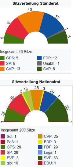 Auch die Grünliberalen konnten zulegen, insgesamt haben sie nun 16 Sitze im Nationalrat, im Ständerat haben sie keine Sitze. Die Gewinne der grünen Parteien gingen zulasten der grossen Parteien – die SVP verlor am meisten Wähleranteile. Auch die SP, die CVP und die FDP mussten Niederlagen einstecken.
